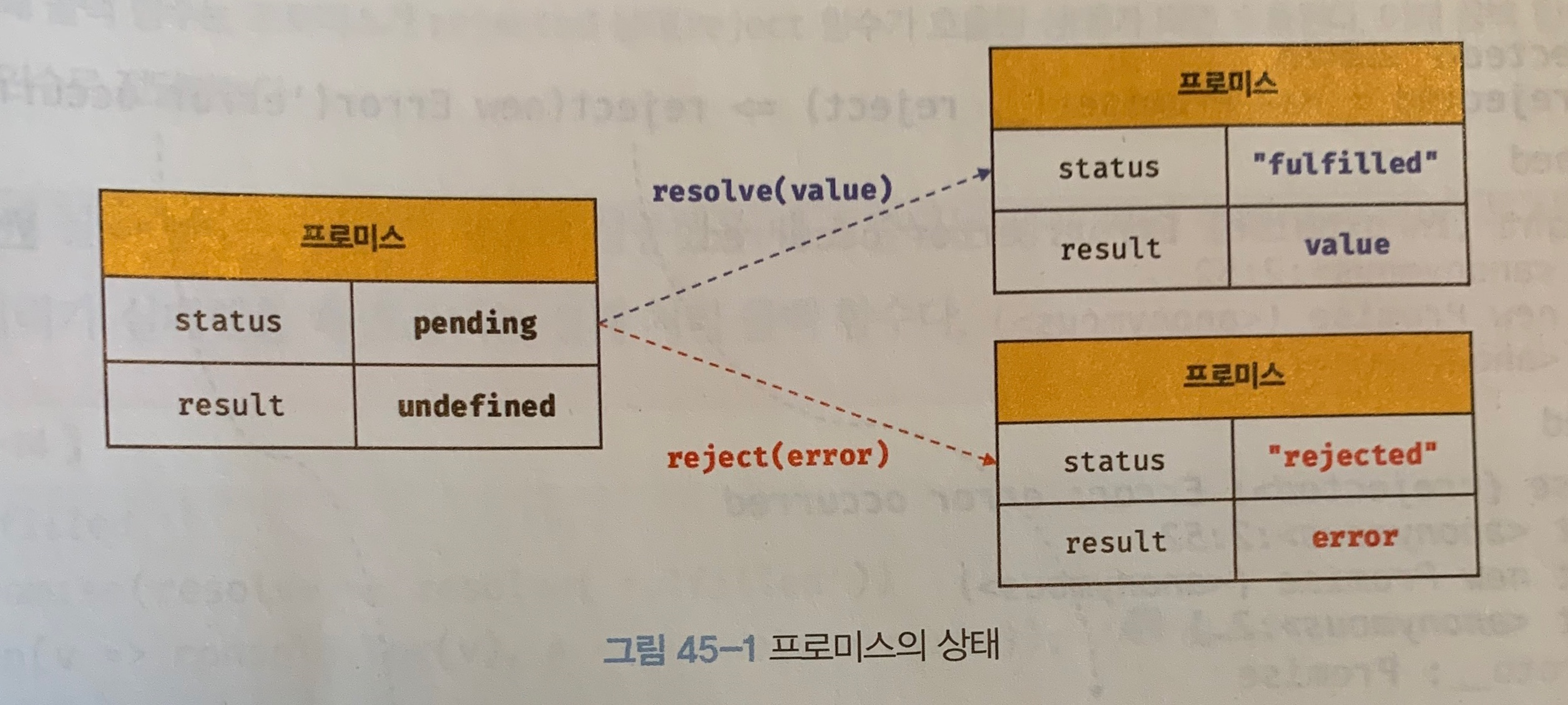์ ๊ทธ๋ฆผ์ฒ๋ผ ํ๋ก๋ฏธ์ค๋ ๋น๋๊ธฐ ์ฒ๋ฆฌ ์ํ์ ๋๋ถ์ด ๋น๋๊ธฐ ์ฒ๋ฆฌ ๊ฒฐ๊ณผ(result)๋ ์ํ๋ก ๊ฐ์ง๋๋ค.