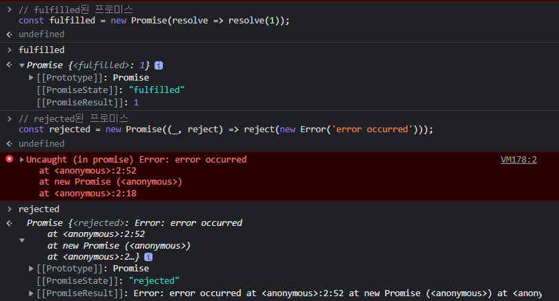 - ๋น๋๊ธฐ ์ฒ๋ฆฌ๊ฐ ์คํจํ๋ฉด ํ๋ก๋ฏธ์ค๋ pending ์ํ์์ rejected ์ํ๋ก ๋ณํํ๋ฉฐ ๊ฒฐ๊ณผ๊ฐ Error ๊ฐ์ฒด๋ฅผ ๊ฐ์ง