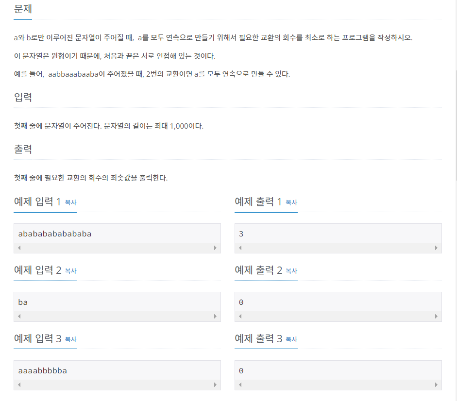 a์ b๋ก๋ง ์ด๋ฃจ์ด์ง ๋ฌธ์์ด์ด ์ฃผ์ด์ง ๋, a๋ฅผ ๋ชจ๋ ์ฐ์์ผ๋ก ๋ง๋ค๊ธฐ ์ํด์ ํ์ํ ๊ตํ์ ํ์๋ฅผ ์ต์๋ก ํ๋ ํ๋ก๊ทธ๋จ์ ์์ฑํ์์ค. ์ด ๋ฌธ์์ด์ ์ํ์ด๊ธฐ ๋๋ฌธ์, ์ฒ์๊ณผ ๋์ ์๋ก ์ธ์ ํด