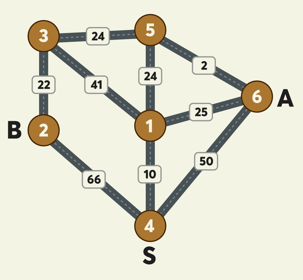 ๋ค์ต์คํธ๋ผ๋ฅผ ํ์ฉํด S, A, B์ ๋ํด ๊ฑฐ๋ฆฌ๋ฅผ ๊ตฌํ๋ฉด ๋ค์๊ณผ ๊ฐ์ต๋๋ค.