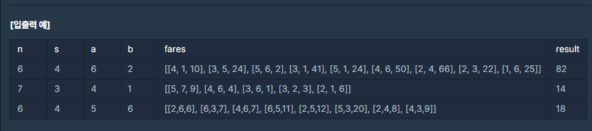 ์ง์ ์ ๊ฐ์ n, ์ถ๋ฐ์ง์ ์ ๋ํ๋ด๋ s, A์ ๋์ฐฉ์ง์ ์ ๋ํ๋ด๋ a, B์ ๋์ฐฉ์ง์ ์ ๋ํ๋ด๋ b, ์ง์ ์ฌ์ด์ ์์ ํ์์๊ธ์ ๋ํ๋ด๋ fares๊ฐ ๋งค๊ฐ๋ณ์๋ก ์ฃผ์ด์ง๋๋ค. ์ด๋, A, B ๋ ์ฌ๋์ด s์์ ์ถ๋ฐํด์ ๊ฐ๊ฐ์ ๋์ฐฉ ์ง์ ๊น์ง ํ์๋ฅผ ํ๊ณ ๊ฐ๋ค๊ณ ๊ฐ์ ํ ๋, ์ต์ ์์ ํ์์๊ธ์ ๊ณ์ฐํด์ return ํ๋๋ก solution ํจ์๋ฅผ ์์ฑํด ์ฃผ์ธ์.