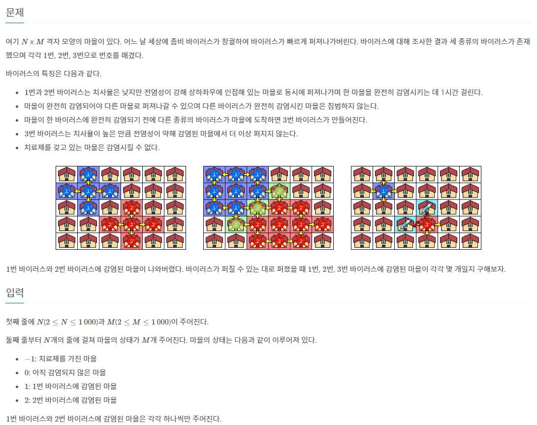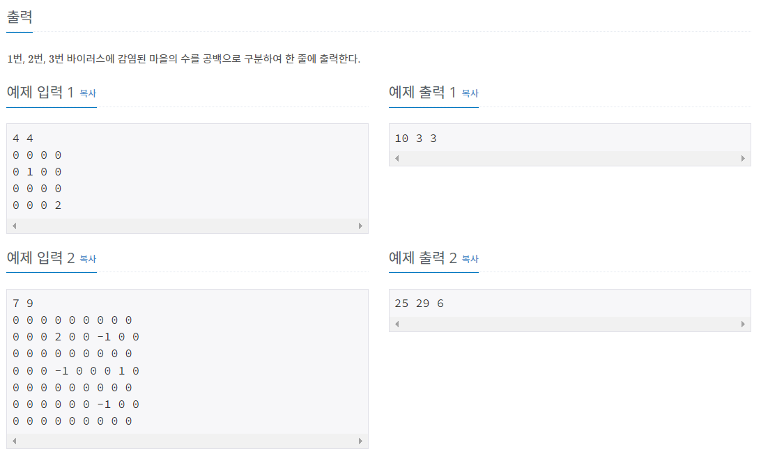 ์ฌ๊ธฐ $N$ x $M$ ๊ฒฉ์ ๋ชจ์์ ๋ง์์ด ์๋ค. ์ด๋ ๋ ์ธ์์ ์ข๋น ๋ฐ์ด๋ฌ์ค๊ฐ ์ฐฝ๊ถํ์ฌ ๋ฐ์ด๋ฌ์ค๊ฐ ๋น ๋ฅด๊ฒ ํผ์ ธ๋๊ฐ๋ฒ๋ฆฐ๋ค. ๋ฐ์ด๋ฌ์ค์ ๋ํด ์กฐ์ฌํ ๊ฒฐ๊ณผ ์ธ ์ข ๋ฅ์ ๋ฐ์ด๋ฌ์ค๊ฐ ์กด์ฌํ์ผ๋ฉฐ ๊ฐ๊ฐ $1$