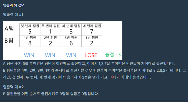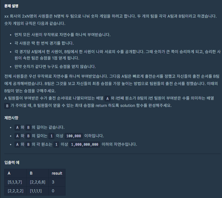 - A[left] < B[right] ๋ผ๋ฉด B๊ฐ ์น๋ฆฌํ๊ณ answer++๋๋ฉฐ left++, right++๋ก ๊ฐฑ์