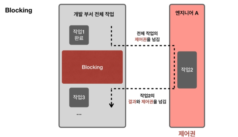 ๋๊ธฐ๋ ์์ฒญ์ ๋ณด๋ธ ํ ์๋ต(๊ฒฐ๊ณผ๋ฌผ)์ ๋ฐ์์ผ์ง๋ง ๋ค์ ๋์์ด ์ด๋ฃจ์ด์ง๋ ๋ฐฉ์์ ๋งํฉ๋๋ค. ์ฆ, ๋ชจ๋ ์ผ์ ์์ฐจ์ ์ผ๋ก ์คํ๋๋ฉฐ ์ด๋ค ์์ ์ด ์ํ์ค์ด๋ผ๋ฉด ๋ค์ ์์ ์ ๋๊ธฐํฉ๋๋ค.