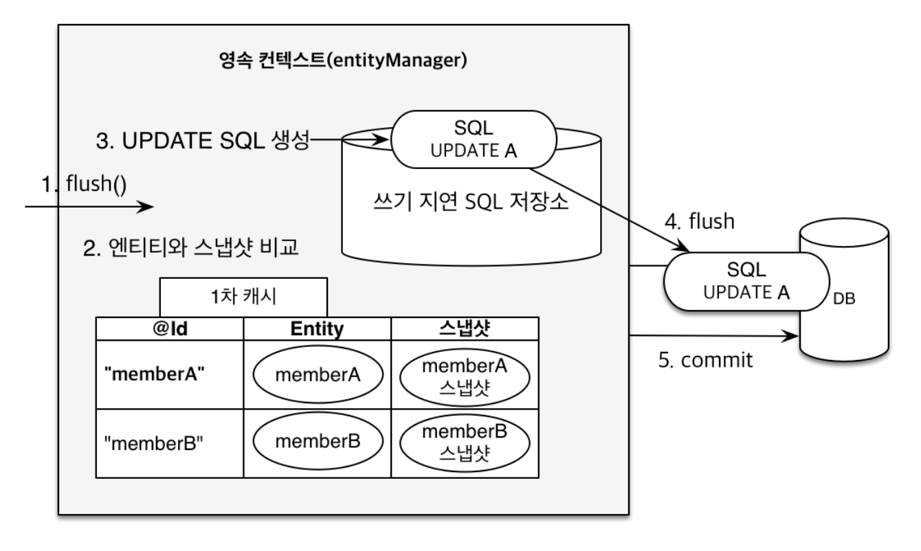 - 1์ฐจ ์บ์ ์์ ์์ ์ํ ์ํฐํฐ์ ์คํญ์ท์ ๋น๊ตํ์ฌ ๋ณ๊ฒฝ์ ๊ฐ์งํ์ฌ, JPA๊ฐ ์๋์ผ๋ก ๋ณ๊ฒฝ๋ ๋ด์ฉ์ ๊ฐ์งํ์ฌ ๋ฐ์ดํฐ๋ฒ ์ด์ค์ ๋ฐ์