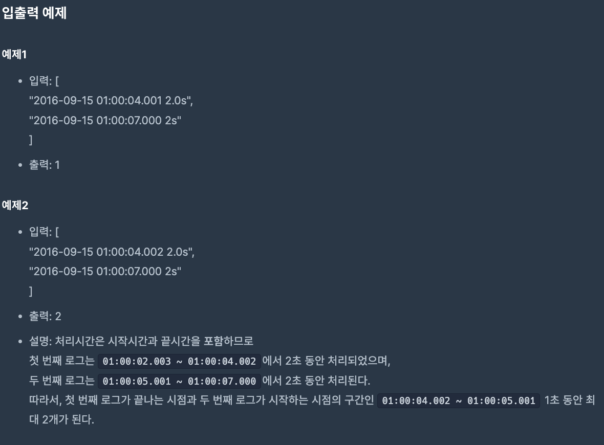 ํ์ด๋ฅผ ๋ณด๊ณ ๋๋ ์ ์ด์ log๊ฐ ๋๋์๊ฐ ๊ธฐ์ค์ผ๋ก ์ ๋ ฌ๋์ด ๋ค์ด์ค๊ธฐ ๋๋ฌธ์ ์ดํ์ log๋ค์ค ๋ช๊ฐ์ ๊ฒน์น๋์ง ๊ตฌํ๋ฉด ๋๋ ๊ฐ๋จํ ๋ฌธ์ ์์ต๋๋ค.