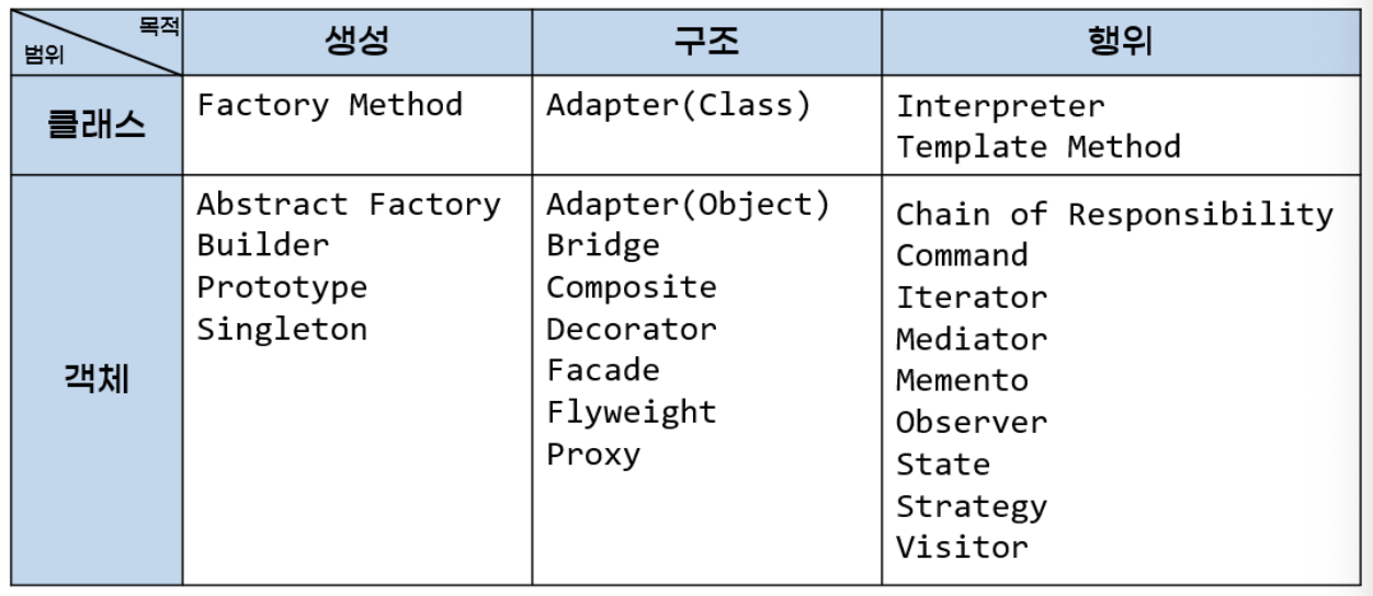 ํจํด์ ์ฃผ๋ก ํด๋์ค์ ์ ์ฉํ๋์ง, ๊ฐ์ฒด์ ์ ์ฉํ๋์ง ๊ตฌ๋ถํ๋ ๊ฒ์ ๋๋ค.