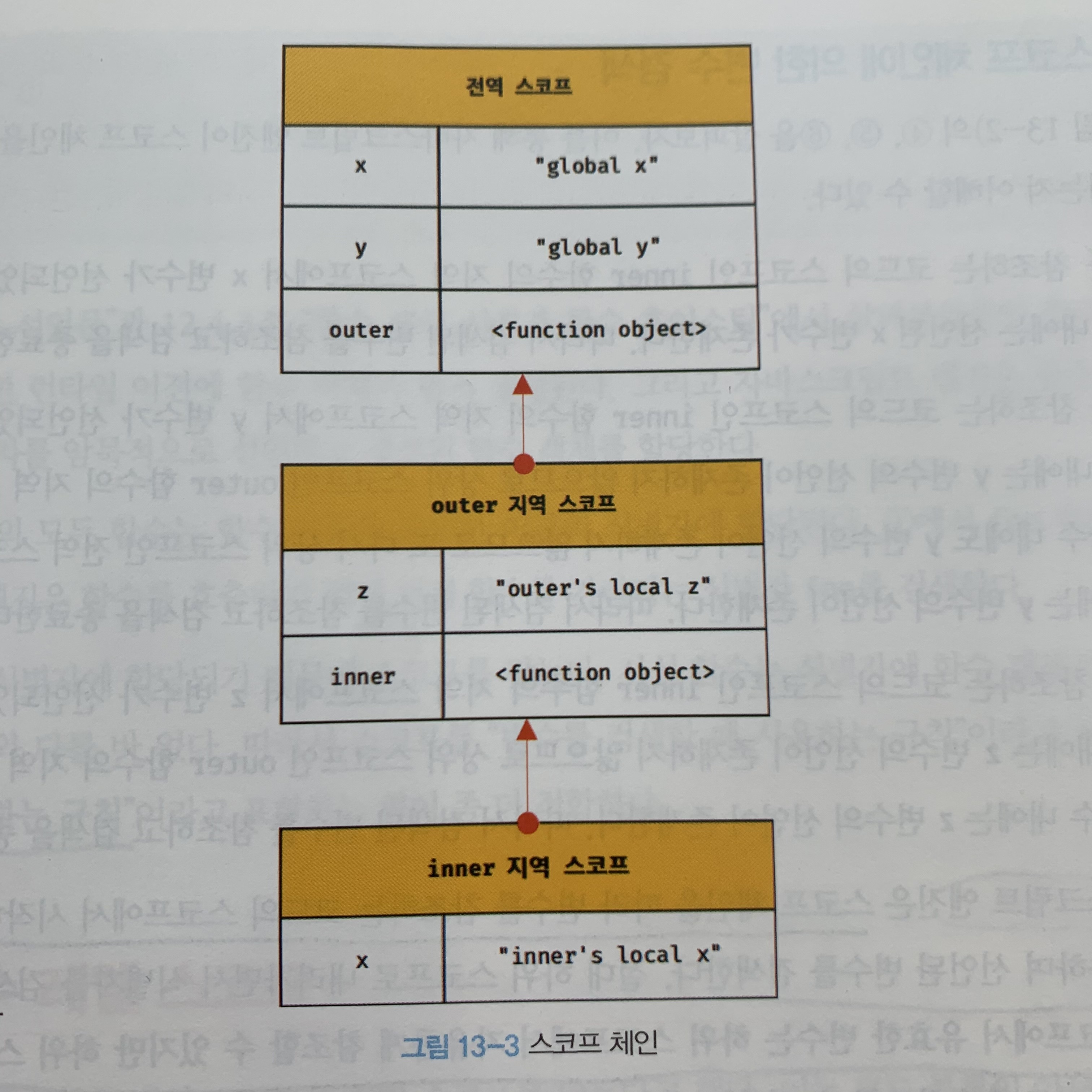 μλ°μ€ν¬λ¦½νΈ μμ§μ μ€μ½ν 체μΈμ λ°λΌ λ³μλ₯Ό μ°Έμ‘°νλ μ½λμ μ€μ½νμμ μμν΄μ μμ μ€μ½ν λ°©ν₯μΌλ‘ μ΄λνλ©° μ μΈλ λ³μλ₯Ό κ²μν©λλ€. μμ μμ μ½λμ ν¨κ» μ΄ν΄λ³΄λ©΄ μλμ κ°μ΅λλ€.
