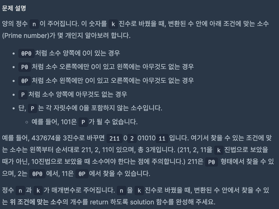 λ¬Έμ μ€λͺ μμ μ μ nμ΄ μ£Όμ΄μ§λλ€. μ΄ μ«μλ₯Ό kμ§μλ‘ λ°κΏ¨μ λ, λ³νλ μ μμ μλ 쑰건μ λ§λ μμ(Prime number)κ° λͺ κ°μΈμ§ μμλ³΄λ € ν©λλ€. 0P0μ²λΌ μμ μμͺ½μ 0μ΄ μλ κ²½μ° P0μ²λΌ μ