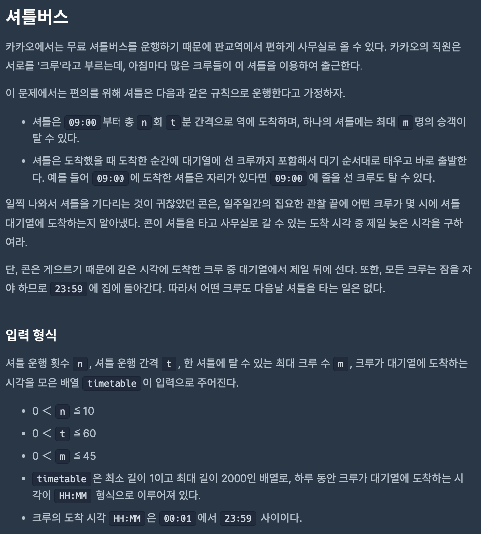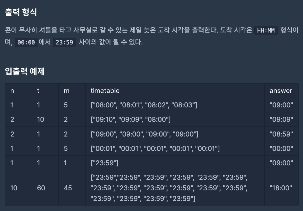 public String solution(int n, int t, int m, String[] timetable) {