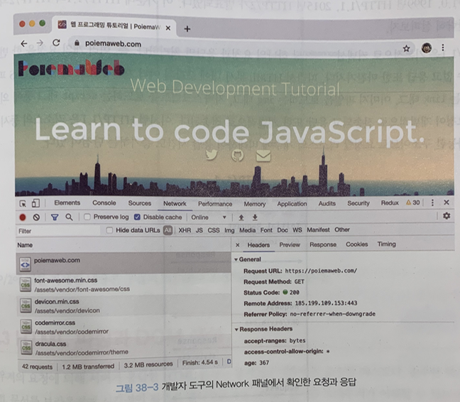 ๋ค์ ๊ทธ๋ฆผ์ฒ๋ผ ๋ธ๋ผ์ฐ์ ๊ฐ poiemaweb.com ์๋ฒ์ ์์ฒญํ ๋ด์ฉ๊ณผ ์๋ฒ๊ฐ ์๋ตํ ๋ด์ฉ์ ๊ฐ๋ฐ์ ๋๊ตฌ์ Network ํจ๋์์ ํ์ธํ ์ ์์ต๋๋ค.