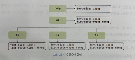 - CSSOM์ CSS์ ์์์ ๋ฐ์ํ์ฌ ์์ฑ๋จ. (body ์์์ ์ ์ฉํ font-size ํ๋กํผํฐ์ ul ์์์ ์ ์ฉํ list-style-type ํ๋กํผํฐ๋ ๋ชจ๋ li ์์์ ์์)