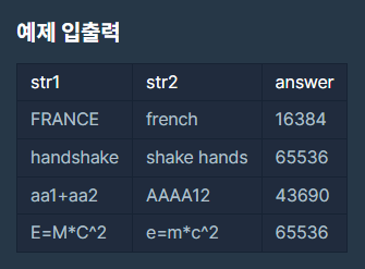 - ์ ๋ ฅ์ผ๋ก๋ str1๊ณผ str2์ ๋ ๋ฌธ์์ด์ด ๋ค์ด์จ๋ค. ๊ฐ ๋ฌธ์์ด์ ๊ธธ์ด๋ 2 ์ด์, 1,000 ์ดํ์ด๋ค.