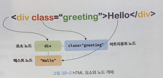 이러한 HTML 요소는 렌더링 엔진에 의해 파싱되어 DOM을 구성하는 요소 노드 객체로 변환됩니다. 이때, HTML 요소의 어트리뷰트는 어트리뷰트 노드로, HTML 요소의 텍스트 콘텐츠는 텍스트 노드로 변환됩니다.