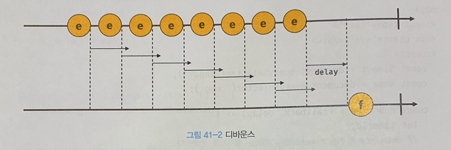 ๋๋ฐ์ด์ค๋ ์งง์ ์๊ฐ ๊ฐ๊ฒฉ์ผ๋ก ์ด๋ฒคํธ๊ฐ ์ฐ์ํด์ ๋ฐ์ํ๋ฉด ์ด๋ฒคํธ ํธ๋ค๋ฌ๋ฅผ ํธ์ถํ์ง ์๋ค๊ฐ ์ผ์ ์๊ฐ์ด ๊ฒฝ๊ณผํ ์ดํ์ ์ด๋ฒคํธ ํธ๋ค๋ฌ๊ฐ ํ ๋ฒ๋ง ํธ์ถ๋๋๋ก ํฉ๋๋ค. ์ฆ, ๋๋ฐ์ด์ค๋ ์ด๋ฒคํธ๋ฅผ ๊ทธ๋ฃนํํด์ ๋ง์ง๋ง์ ํ ๋ฒ๋ง ์ด๋ฒคํธ ํธ๋ค๋ฌ๊ฐ ํธ์ถ๋๋๋ก ํฉ๋๋ค.